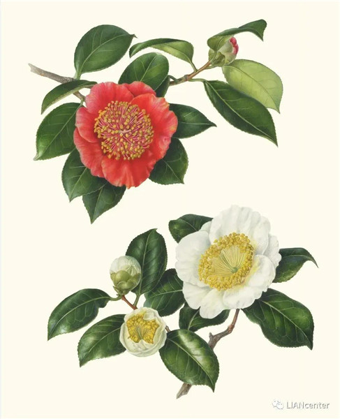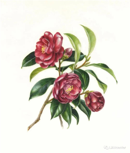 这两幅作品亦是2016年Akiko Enokido参加英国伦敦RSH植物绘画艺术展,获得金奖的"日本古典山茶"系列中的两张作品。本次Akiko将自己的金奖作品——最美的两款日本山茶投给湖北特展,表达对湖北人民的深切祝福。