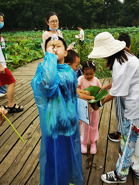 “老师,沉水植物吐了好多泡泡。”“老师,我看见狐尾藻中间的孔了,但是吹不出气来。”“老师,水葫芦的气囊可以听见声音。”“老师,我看见王莲了,我可以试试坐上去吗?”“老师,荷叶叶柄的气孔好大呀,可以当万花筒。”户外探究环节,曹老师带领孩子们在沉水植物展示区、荷花睡莲展示区进行植物的打捞、观察、探究和记录。主讲老师和助教老师充分调动孩子们的五感,让其化身为“小小植物勇士”,通过感官体验,对水生植物“四大家族”在水中的生存方法一探究竟。在老师们的引导下,孩子们纷纷分享了自己的观察结果并提出了心中的疑问,现场热闹非凡。户外探究的最后,在荷花展示区的木质平台处,孩子们拿着老师采摘分发的荷叶柄,在吹泡泡的游戏中,深度体验了水生植物为了适应水中生存环境,练就的发达的通气组织。