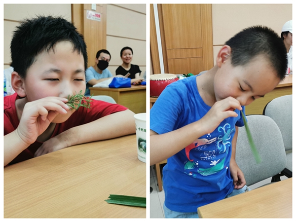 回到室内,通过“闻香识叶”的环节,孩子们专注的闻一闻相关叶子的味道,了解了芳香叶片和它们在生活中的广泛用途。