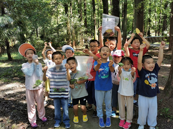 在户外,两位老师带领小朋友们沿路探寻并收集各种叶片,大家一路都有惊喜的发现:“哇,我找到心形的叶子啦”,“这个叶子是紫色的三角形,真漂亮啊”,“竟然还有像羊蹄的叶子”老师还带领大家认识了国家二级保护植物马褂木形似马褂的叶片…… 孩子们在探寻叶子的过程中,一路热情兴奋,情绪高昂。