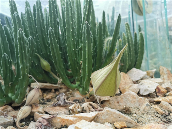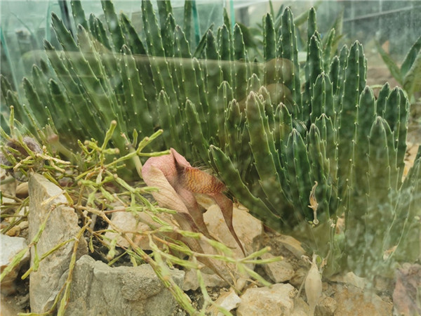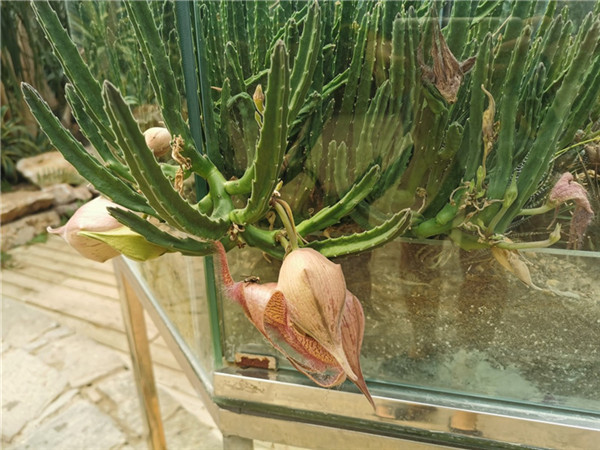 武汉植物园景观温室里的多肉多浆室一共栽种了十几株大花犀角,目前开放了一半。它们被种植在多肉多浆室的玻璃景观箱内。