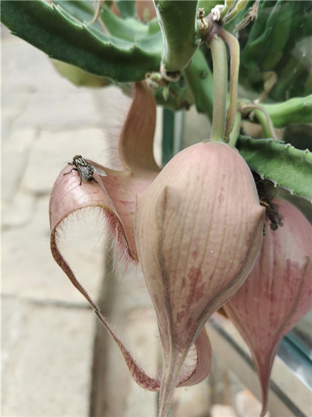 散发着臭味的大花犀角吸引臭味相投的苍蝇们前来帮忙授粉。在其它开花植物大多追求美且香的潮流中,它反其道而行之,也不失为一种独辟蹊径的繁殖策略。