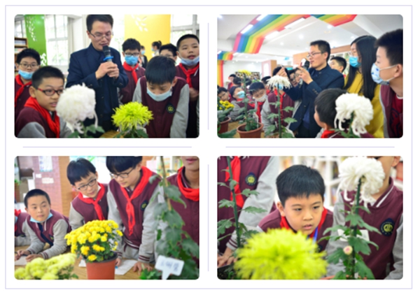 菊花原产我国,是我国十大名花之一,有着3000多年的文献记载历史,至今已经发展成为世界上品种最为丰富的栽培植物之一,菊花如此之多的品种和变异类型成为现代花卉育种的一大奇迹。本次研学课程,有着多年菊花培育经验的张永宽老师从菊花文化引入,带领同学们认识中国传统名花菊花,了解菊花的种质资源现状,认识菊花丰富的栽培类型和展出形式,并现场带领小朋友观察菊花丰富的瓣型,学习鉴赏菊花之美。活动伊始,孩子们就早早地来到课程体验中心,翘首以盼。在讲解的过程中,张永宽和张凡还通过提问抢答的方式进行互动,孩子们参与的积极性可高了,学习氛围活跃热烈,趣味盎然。