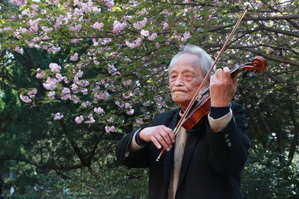 图:王欣老先生在武汉植物园樱花树下演奏最爱的乐曲