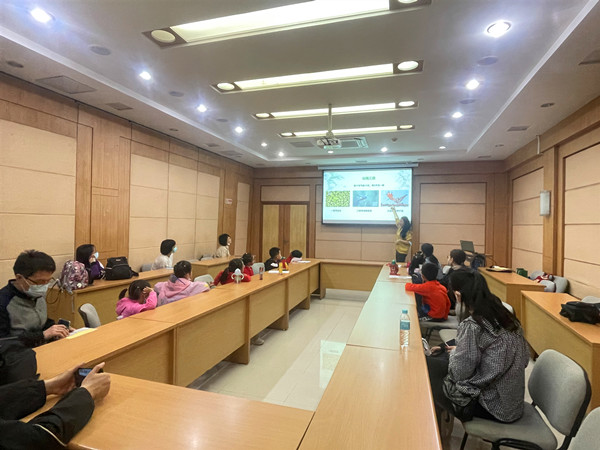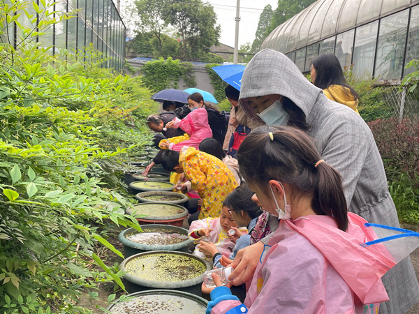 本次课程分为室内讲解、户外认知观察、动手体验三个环节。室内讲解时,曹老师以图文的形式,从谷雨的日期、含义与节气特点;谷雨三候与植物生长状态;谷雨的习俗与农事;谷雨的诗词等方面讲述了谷雨这一节气的相关知识,让孩子们了解中国传统文化,同时也调动了孩子户外认知观察的兴趣。户外认知观察环节,虽然下着小雨,但是大家兴致勃勃。曹老师以谷雨一候萍始生为着手点,带领孩子们在水生温室旁的种植缸中,观察浮萍的生长状态、寻找形态各异的萍。课程中,曹老师和袁老师鼓励家长和孩子们一起,动手捞浮萍,调动视觉和触觉,认知和观察自己找到的萍的差异,并分享自己找萍的感受。动手体验环节,亲子合作,以盆栽的形式种植了落花生,带回家后在发芽生长过程中,观察植物生长,感受生命的力量。