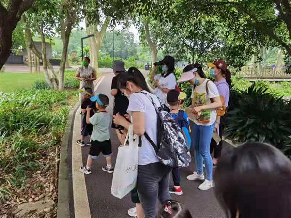 户外环节,由李俊皞老师带队,分组带领亲子家庭在园区进行鸟类实地观察活动。大杜鹃、四声杜鹃、噪鹃、鹰鹃等杜鹃鸟,是市民在武汉地区容易听见其叫声但不容易瞅见其真身的夏候鸟。它们叫声响亮,但擅长隐藏自己。武汉植物园是杜鹃鸟比较集中的地方。亲子家庭的孩子们听到鸟儿的鸣叫惊喜不已。在水岸,孩子们观察到了小白鹭、黑水鸡、棕背伯劳等鸟儿。孩子们和父母观察到棕背伯劳在路边的再力花杆上东张西望,寻找猎物。李老师实地讲解,原来棕背伯劳性凶猛,嘴爪均强健有力,善于捕食昆虫、鸟类及其他动物,甚至能击杀比它自己还大的鸟,如鹧鸪之类。平时常栖止于芦苇梢处,东瞻西望,一见地上有食物,就直下捕杀。能在空中捕食飞行的昆虫和小鸟。是一种肉食性鸟类,主要以昆虫为食,也捕食小鸟、青蛙、蜥蜴和鼠类,偶尔还吃些少量植物种子。