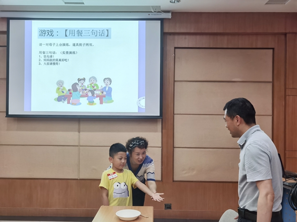 课程特别邀请到国家注册高级礼仪培训师、湖北礼仪学会联盟成员苏莉丽老师。“夫礼之初,始诸饮食”,正确使用筷子反映出一个人的教养,今天的筷子已经不单是一种就餐工具,更是一种独特的文化形式,每个家庭的餐桌里其实都紧密相连着孩子的未来。苏莉丽带领孩子正确了解进餐礼仪,并针对孩子们吃饭时对于筷子使用的一些不文明行为逐一做出解释,了解忌讳的原因,使孩子们知其然知其所以然,而不是仅仅停留在“不”的教育中。苏莉丽授课风格深入浅出,亲和力强,采用生动讲解、趣味游戏和情景演绎等多种互动形式,让孩子们和家长在轻松活泼的气氛当中快乐的学习。