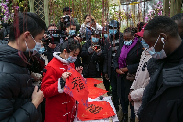 “新年快乐!”1月26日正值南方农历小年,来自武汉植物园的16位留学生团聚在一起,用写福字、吹糖人、挂中国结、赏花的方式共度小年。他们在各种小年习俗中感受浓浓的中国年味,体验了地道的中国年。