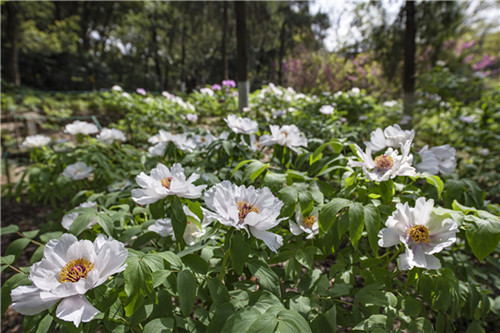 目前,牡丹园已经开放近四成。保康牡丹、紫斑牡丹、凤丹牡丹先声夺人,全部开放。保康牡丹以白色、粉白色居多,如霞似雪,馨香袭人。保康牡丹花朵多顶生,花朵凌于叶片之上,朵朵白雪汇成花海,其飘逸的姿态轻逸出尘,一展牡丹的婉约风姿。