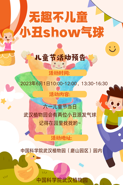 世界很大,童心不必长大。武汉植物园“无趣不儿童 小丑show气球”活动,让多彩、趣味的气球交错组成植物园的夏日色彩,编制成一个五彩的梦境,置身其中一起唤醒童心,做一个无忧无虑的小孩。六一儿童节当日,武汉植物园会有两位小丑派发气球,记得在园里找找哟~