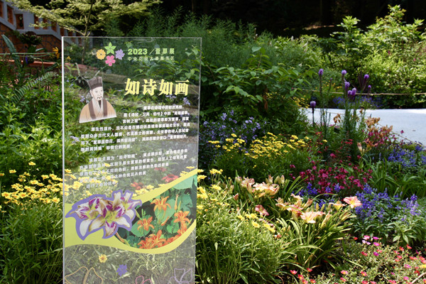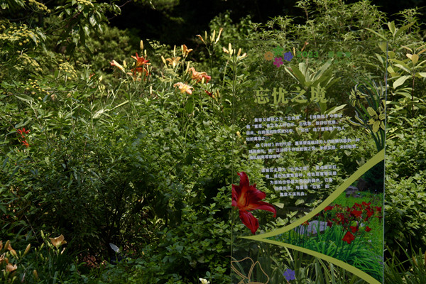 “忘忧之境”以红黄橙色等亮色系、暖色系萱草为主要栽种品种,为观赏者带来轻快明丽的视觉体验。“慈母之心”区域以母爱为主题,重点展示重瓣萱草品种。重重叠叠的花瓣,好似温柔地怀抱着孩子的母亲一般,美丽且令人安心。“如诗如画”区域以“古诗词中出现的花卉”为主题,以浪漫唯美的粉紫色系为主色调进行布展。萱草有众多园艺品种,是布置庭院、花园、花境的常用花卉。“百草之庭”区域以蜘蛛型等极富特色花型的萱草品种为主。蜘蛛型是萱草中一种极其特殊的花型,判断标准为“花瓣长度达到花瓣宽度的四倍以上”,因垂下的花瓣形似蜘蛛的脚而得名。“夏日回忆”区域以园艺造景为主,重点展示萱草的夏花胜景。