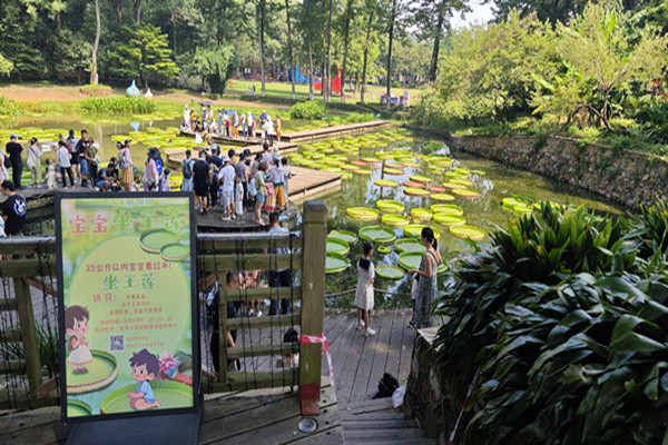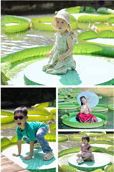一大早,不少小朋友就来排队坐王莲。一个直径约1.5米的王莲叶片成为小朋友们的“小舟”。小朋友们在工作人员的协助下,从水中栈道登上王莲这座特殊的小舟,他们在王莲叶片上或坐或站,十分兴奋。有的小朋友还大大方方摆出各种姿势,向家长开心比手势。当天,110位小朋友参与了坐王莲活动。