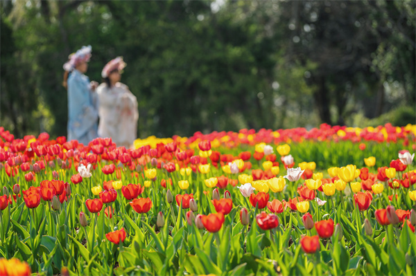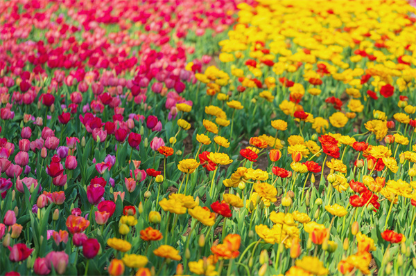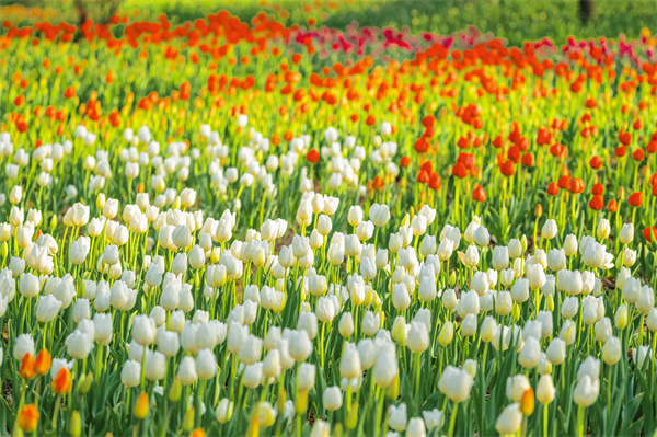 武汉植物园以现有生态景观为依托,结合地势地形和生境特点,打造郁金香平地景观、林地景观、水系景观。五个展区各具特色,共同展示郁金香的色彩美、艺术美、环境美。湖岸带花田郁金香享受阳光慷慨,最先开得灿烂。这里的郁金香根据不同花色分带状种植,赤橙黄绿青蓝紫,20多条彩带如织锦般绣出七彩花毯。风吹树动、流水潺潺,姿态柔美、色彩绚丽的郁金香和周边美景共筑成灵动的滨水景观。菊花圃大量使用红、橙、黄等暖色系的郁金香,给人明亮温暖的观赏感受。郁金香结合狭长的地块构造出流水、浪花和帆船的图案,微风吹过,色彩翻涌、跳跃,流淌成绵延不绝的花海。入口林下,郁金香配置多种球根花卉,以吉祥的龙纹作为设计元素,形成“祥龙踏春”的花卉景观。密林展区,郁金香搭配花葱、美丽月见草、白晶菊等花卉辅材,结合蜿蜒的赏花步道打造花卉迷宫。游人穿行其中,乐趣融融。中央花境大道大胆着墨,以黄、蓝对比色的郁金香为主色调,白色、粉色郁金香点缀其中,碰撞出鲜明的视觉冲击力。国风浓郁的园林景观与郁金香交相辉映,绘就古典与现代交织的画卷。