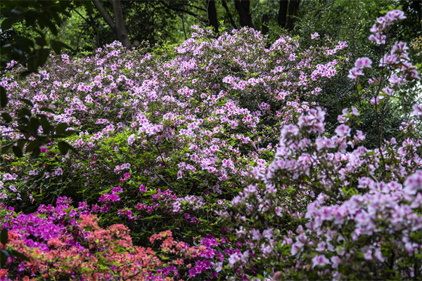 春风将武汉植物园荡漾翠绿的山林吹成漫天嫣红,杜鹃花儿浩浩荡荡地蔓延开来,似燃烧的花火,热烈又浪漫。武汉植物园按照一园多线的布局来打造杜鹃景观。杜鹃园模拟野生杜鹃生境,依据坡地落差分类种植亚高山类杜鹃,还原亚高山杜鹃层林红遍繁花似锦的景况。此时,大片大片的杜鹃灿然开放、映山红遍,浪漫直击心田。走进杜鹃园,一团团一簇簇的杜鹃沿着小径逶迤绵延,指引人走进繁花深处。蜿蜒的小径边各色杜鹃次第开放,人在路上走,更在花下游。一些高大的乔木在为杜鹃遮蔽骄阳的同时,也带来了密林掩映的美感。