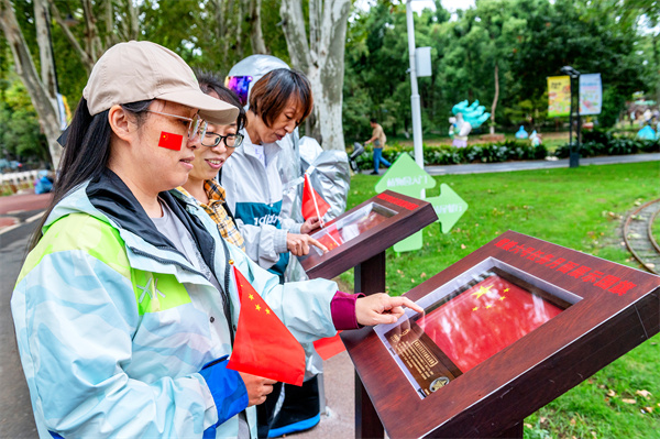 有一种敬意,叫“与国旗同框”;有一种美,叫“和国旗合影”。国庆假期,武汉植物园内多处五星红旗迎风飘扬,鲜艳的中国红与繁花绿树相得益彰,成为国庆假期最靓丽的一道风景。自然教育中心主楼高扬的巨幅国旗成为最受欢迎的打卡点,游客纷纷与国旗同框拍照,为祖国发出真挚告白。假期,武汉植物园还迎来了两面特殊的国旗展品——嫦娥五号月表国旗和嫦娥六号月背国旗的同款国旗,吸引了不少游客关注。两面登月同款国旗由武汉纺织大学徐卫林院士团队提供,让游客感受到湖北“智”造的科技力量。不少游客争相与登月同款五星红旗同框,近距离感受中国航天的科技魅力。
