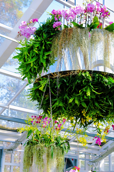 在“流光溢彩”展区,蝴蝶兰、文心兰与镜面材料、水元素完美融合,以“镜中兰”、“水中兰”构建一个如梦如幻的光影世界。“生态兰图”展区则紧扣“玄”主题,巧妙结合自然与科幻元素,用蝴蝶兰、兜兰、国兰及蕨类植物组合搭配模拟外星系生态群落,打造出独特的空中花园效果,让游客仿佛置身于自然之中,感受与自然的无缝交融。“xuan”展区则以特制的云朵状悬挂装置将蝴蝶兰和万代兰高高吊起,辅以龟背竹、鸟巢蕨等蕨类植物的点缀,营造出强烈的悬空视觉效果,极具冲击力。在“兰动万象”展区,春石斛与秋石斛以悬挂之姿演绎雨水的婉转形态,竖式镜片巧妙布局,营造出兰花轻摇、万物生辉的镜中奇景。室内各立柱装点的兰花自然垂落,游人拂面而过,宛若置身自然怀抱,触手可及生机盎然之美。