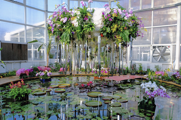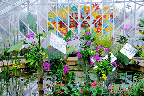 作为今年的新增展区,武汉植物园水生温室模拟了高山沼泽、飞瀑激流、近岸海床等多种生态环境,展示着全球300余种热带及特殊生境下的水生植物,营造出既生机勃勃又宁静舒适的自然景观。借助这一得天独厚的自然环境,展览以兰花为主花材,融合现代科技与自然元素,大量运用镜面纸、镜面贴、不锈钢等镜面材料来映射兰花的梦幻与炫彩,通过“兰动万象”、“流光溢彩”多个景点打造“水中花”、“镜中花”、“幻中花”,展示兰花的多样之美。