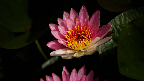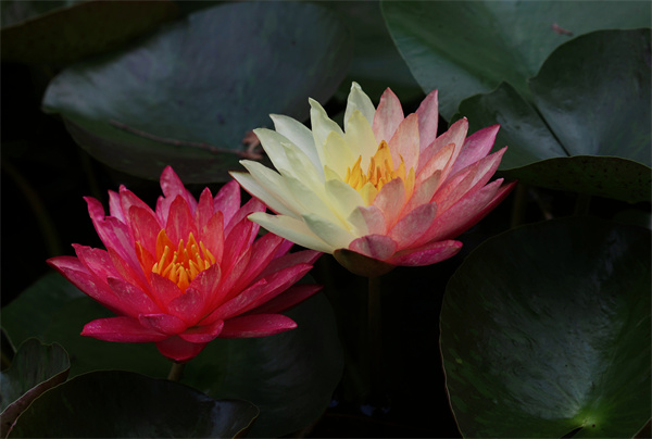 “粉色黎明”也曾获得IWGS最佳耐寒睡莲品种的称号。“粉色黎明”则是粉白两色随机配色 ,花瓣略带斑点,姿态舒展,在一池的波光潋滟中显得娇俏动人。其中一朵“粉色黎明”粉白两色平分花瓣,花色泾渭分明,宛若“水上佳人”清新灵动。