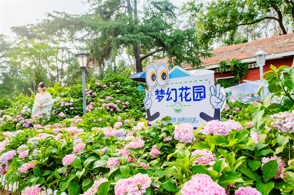端午期间,武汉植物园8000平方米绣球花海正值盛放期,各色绣球交织成流动的调色盘,打造出多层次生态景观。中央花境大道生态长廊上,绣球与铁线莲、萱草错落绽放,复古红房邮筒与铁艺桌椅点缀出夏日闲适感在水生生态区,岸边层层叠叠的绣球如波浪般蔓延,与睡莲、千屈菜共同构成莫奈花园般的诗意空间。湖畔林下展区,一眼看遍30多个绣球热门品种,粉蓝色系绣球与糖果色邮筒、白色邮票框打造立体小景,方便游客拍照打卡。