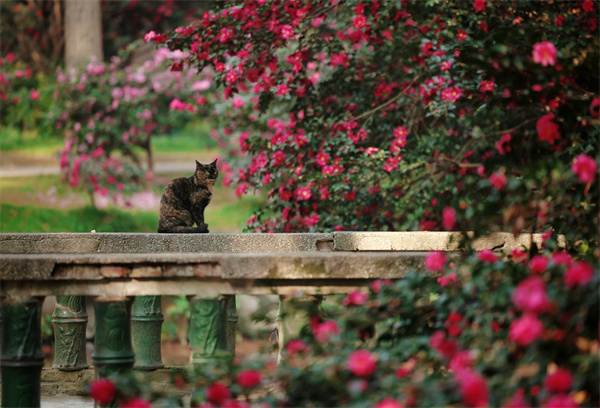 濬溪桥周边是茶梅最密集、景观最丰富的区域。大片茶梅依水而植,花开如火如荼,与古朴的小桥、潺潺的溪水、苍劲的树林共同构成一幅生动的冬日画卷。站在桥上,可以拍到花海与溪流的交融;也能低机位仰拍繁花、小桥与天空的框架构图。清晨或午后光线柔和时,水面泛起粼粼波光,与茶梅的倒影相映成趣,是拍摄风景照的绝佳时机。芙蕖亭附近有几棵高大的茶梅,已是繁花满树。在该处利用亭台、石凳、流水作为前景或框架,茶梅花海作为主体,可增加画面的故事性和层次感。