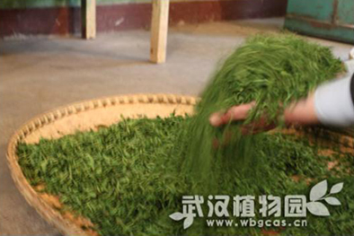 揉捻:揉捻叶在揉捻时受到压力作用,叶团发生皱褶,部分叶细胞扭曲破裂,挤出茶汁,附在表面上,增加了叶子粘结性,其中水溶性物质组成茶汤浓度。