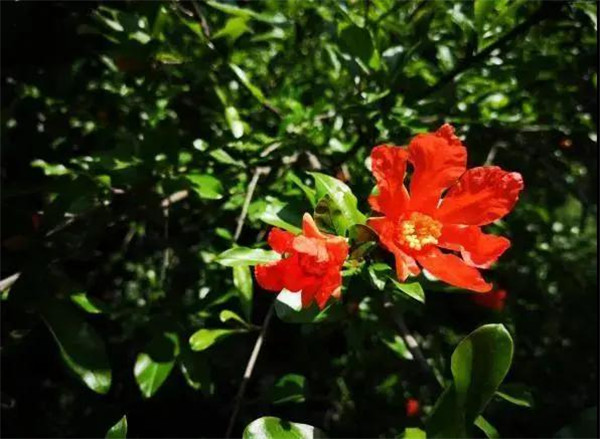 石榴枝繁叶茂、花色艳丽、花果期长,观赏价值极高。