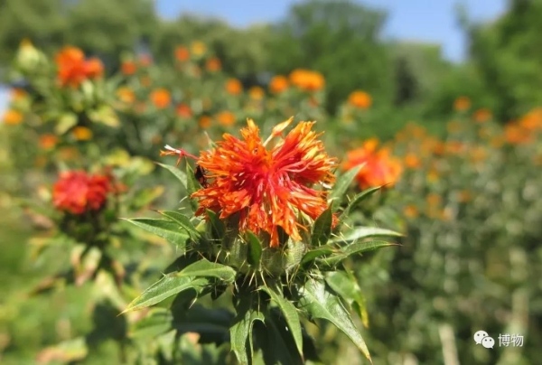 还有更迷惑的呢,红花最初叫红蓝花,《博物志》称它为黄蓝,《古今注》称它为红蓝。不过它实际和蓝色没什么关系,红花初放时的花冠就是黄色的,成熟后,花冠逐渐变为橘红色。