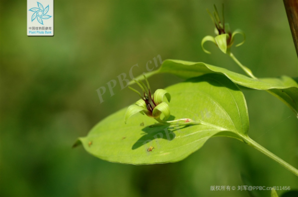 叶上开花结果的植物,除了青荚叶外,百部也具有这样独特的特征。百部(Stemona japonica (Bl.) Miq)百部科百部属的植物。百部属有30多种植物,主要分布在亚洲、大洋洲和北美洲的亚热带地区。我国有大约5种。其纤细的花序柄贴生于叶片中脉上,花单生或数朵排成聚伞状花序;花被片淡绿色,披针形,开放后反卷。蒴果卵圆形,成熟后呈赤褐色,有2爿开裂,通常有2颗种子。虽然都是叶上开花结果,但百部看上去比较“纤弱”,观赏价值稍稍弱于青荚叶。