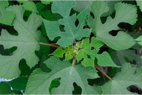 小时候的夏季,我们常会在构树下玩耍。发现 构树 会长出两种不同形状的叶子,一种是3-5深裂,一种是全缘不分裂。一般是构树苗或大的构树基部萌蘖枝的叶片会有分裂,大树的叶片常常不裂或浅裂。我们喜欢将小的构树叶子放在胸前按压,让叶背面密被绒毛粘在衣服上,顿觉盖上了一枚颇具魅力的植物勋章,如同现在的小朋友喜爱花样繁多的即时贴一样,贴在胸前快乐无比。