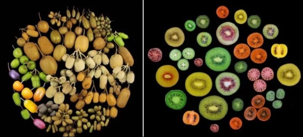 不同种类的猕猴桃从外观到口味都千差万别。果实形状有圆柱形、卵形、倒卵形、球形等至少15种类型;果肉颜色存在从绿色、黄色、黄橘色、粉色到紫色的广泛变异;果皮毛被从光滑无毛到刺毛猕猴桃的长硬毛,呈现广泛连续的变异;果实风味更是酸、甜、苦、辣、麻应有尽有。