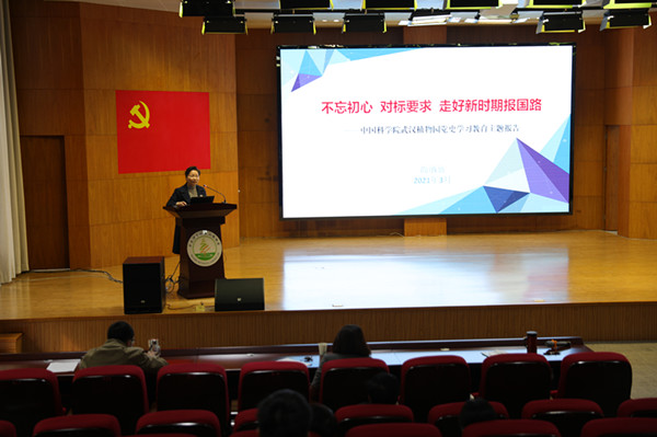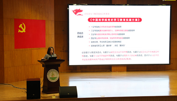 尚纳新作了《不忘初心,对标要求,走好新时期报国路》党史学习教育专题报告。她从知史爱党、知史爱国的角度,讲述了为什么历史和人民选择了中国共产党。她指出,百年来,中国共产党领导中国人民从苦难中站起来、强起来,至今初心不改、使命依旧,有力证明了人民政党维护人民利益的坚定信念。她从学史明责,学史担当的层面,讲解了如何砥砺国家战略科技力量的初心使命。她强调,老一辈科学家以“国家的需要就是我的专业”的拳拳赤子之心,展现了科学院人的爱国之情。站在“两个一百年”历史交汇点上,我们要传承老科学家精神,树牢“国家队”“国家人”意识,担好“国家事”“国家责”,在党史学习教育中凝聚矢志科技报国的强大动力。