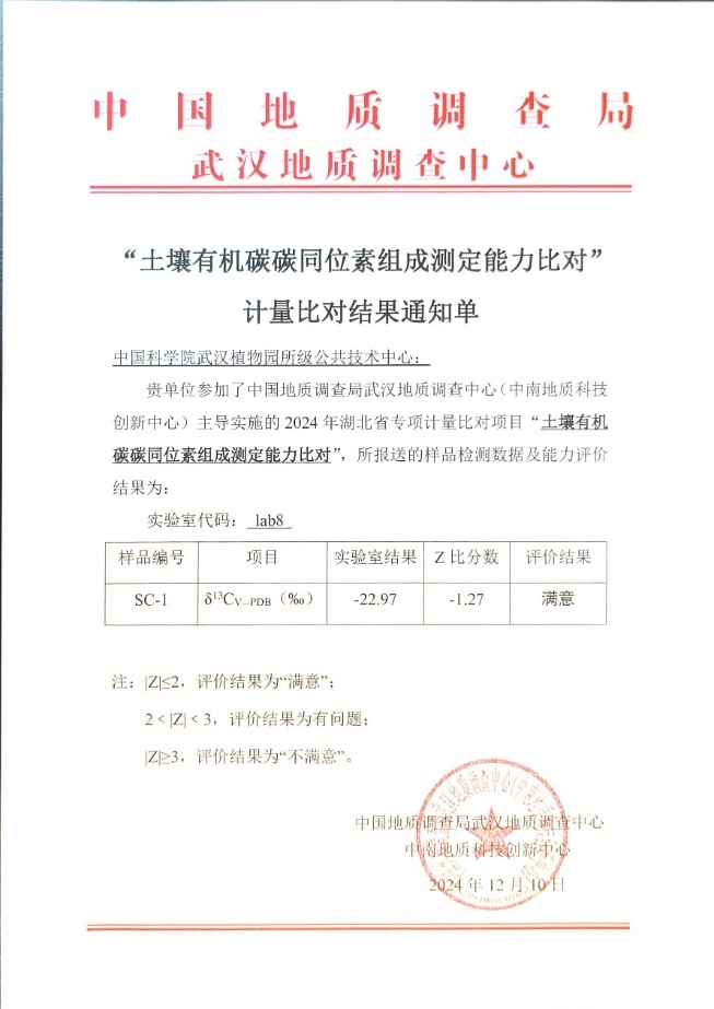 此次实验室间比对获得满意结果并获证书,表明武汉植物园公共实验平台具备较高水平的碳同位素比值指标的检测技术能力,所测相关项目数据可靠、值得信赖。今后,平台实验人员也将继续加强仪器设备的学习和运用,提高检测能力,扩展检测项目,以期为武汉植物园的科研等各项工作提供更好的技术支撑服务。