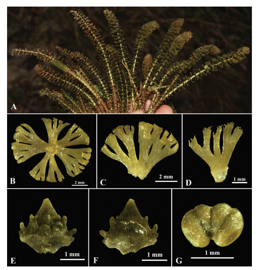 2017年,中-非联合研究中心组织联合科学考察队在马达加斯加中部进行野外科考时,发现了水穗草属(Hydrostachys)一个形态特殊的类群,该类群植物在形态上与马达加斯加已记载的H. verruculosa和H. laciniata两个种较为相似,但又区别明显,其独特的个体形态引起了考察人员的注意。在进行仔细的标本比对和大量文献查阅之后,发现该植物叶片结构特殊,明显区别于该属下所有已知种类,与相似种之间,也可以通过其独特的形态特征,如:叶较短,只有3–12 cm 长,叶片裂片常为扇形,稀疏地排列在叶轴上等特征容易区分开来。为确定其在水穗草属中的系统位置,作者们对水穗草属(Hydrostachys)中的9个物种进行了DNA测序,并选取3个蓝果树属(Nyssa)和1个露松藤属(Triphyophyllum)植物作为外类群,构建了基于核基因ITS序列的系统发育树,分子系统学研究结果同样支持其为本属的一个新种。根据该新种叶片裂片扇状这一明显特征将其命名为扇叶水穗草(Hydrostachys flabellifera G.W. Hu, Zhun Xu & Q.F. Wang)。
