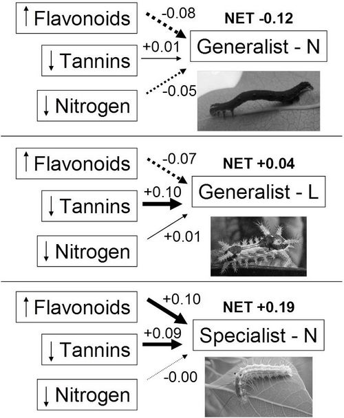 化学防御物质的变化导致了专食性昆虫在入侵地种群上发育更好,而广食性昆虫则不然