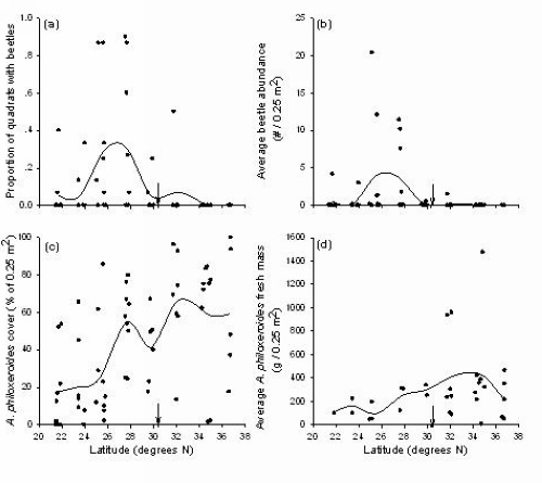 沿纬度梯度空心莲子草(a和c)和莲草直胸跳甲分布特征(b和d)