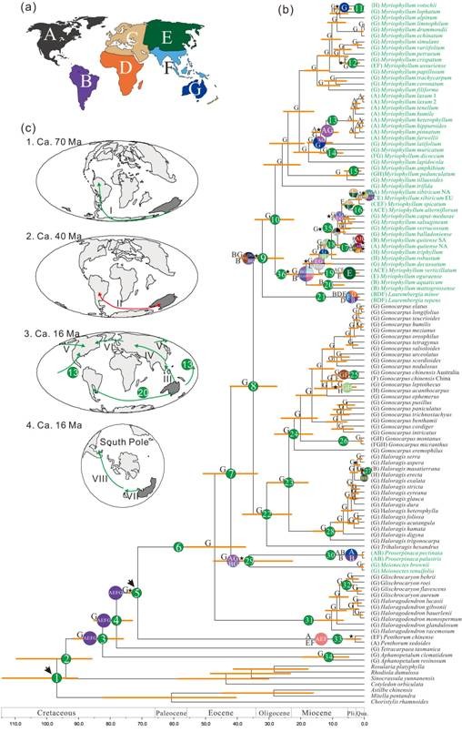 在水生植物适应性进化学科组王青锋研究员的指导下,陈凌云博士等人选取了该科102个物种、4种DNA片段,以保守的策略筛选了两个化石,并进行了分子钟分析。研究结果表明,现存小二仙草科植物在37.3-56.3 万年前起源于澳大利亚地区,早期起源的植物通过隔离实现了在澳大利亚和南美洲的分布;上新世和中新世时期,该科植物从澳大利亚向亚洲、欧洲、北美洲和新西兰进行扩散。小儿仙草科植物跨大洋分布格局主要是通过中新世时期及以后的扩散来实现,水生类群相比陆生植物具有更普遍的跨大洋分布现象,这可能归因于鸟类的长距离传播。该研究为理解南半球起源的被子植物如何实现全球分布提供了新思路。