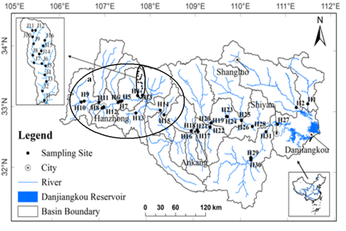 汉江上游流域河流的采样点 (H1-H33) 及其支流金水河的采样点 (J1-J16)