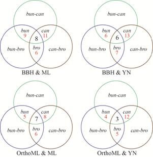 (红色数字,如 ‘bun 9’指R. bungei-R. cantoniensis与R. bungei-R. brotherusii之间,共有9个来自于R. bungei的基因受到了正选择压力)