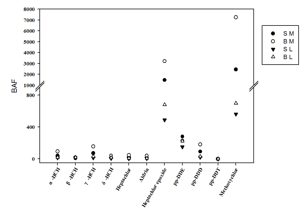 鱼体内有机氯农药的生物富集系数 (B: 鳙鱼S: 鲢鱼 M: 肌肉样品 L: 肝样品)