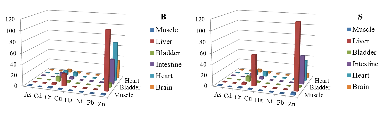 鳙鱼 (B)和鲢鱼 (S)各组织内的重金属含量 (mg·kg-1, 干重)