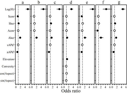 八大公山25公顷森林动态样地幼苗群落水平及各生活史策略类群(生长型,叶片类型及扩散模式)最优模型中各变量对幼苗存活效应的比值比(odds ratio)