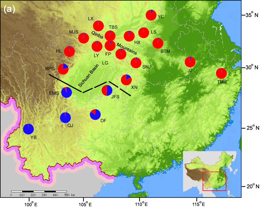 四川盆地而非秦巴山地为领春木扩散障碍(图1取样示意图;饼图为贝叶斯聚类分析结果;黑色折线为障碍分析结果)