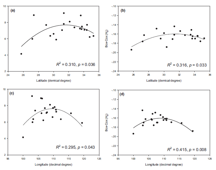(图2遗传多样性的纬度梯度和经度梯度格局;AR等位基因丰富度Allelic RichnessHE预期杂合度Expected Heterozygosity