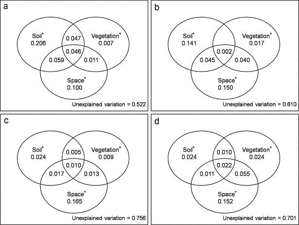 利用环境(土壤、植被、地形)和空间因子(PCNM)对土壤碳氮的空间变异进行方差分解,发现:环境与空间因子对表层土壤有机碳空间变异的解释力(47.8%)高于亚表层土壤有机碳(24.4%)。各环境因子的解释力由高到低依次为:土壤>植被>地形。其中,具有显著作用的土壤因子包括土壤pH,有效磷和土壤颗粒组成。各环境因子间具有强烈的交互作用。