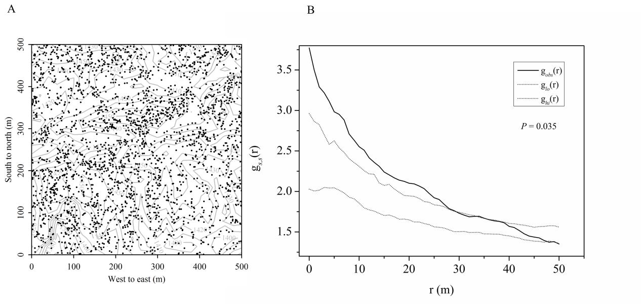 基于湖南八大公山25公顷森林样地木本植物枯立木(dbh ≥ 10 cm)调查数据,重点实验室植被生态学学科组利用单变量,双变量成对关联函数g(r) 对枯立木空间分布格局、枯立木与活立木之间关联性进行分析;并利用广义线性混合模型(GLMM)分析了邻体密度与地形因子对树木死亡的影响。
