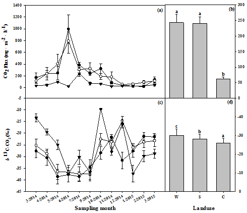 重点实验室土壤生态学课题组博士生张倩和助理研究员吴君君在程晓莉研究员的指导下,以丹江口库区农田、灌丛和森林为对象,进行了为期一年的土壤呼吸及其同位素的测量。研究结果表明,造林显著增加了土壤呼吸,造林显著增加了土壤有机碳的数量和质量,从而使土壤呼吸增加。土壤呼吸碳同位素值与微生物碳同位素值呈显著正相关关系,造林改变了输入到土壤中凋落物的碳同位素信号值,进而使土壤呼吸同位素值产生变化。土壤呼吸可以作为土壤有机碳质量和数量较为灵敏的指示器,土壤呼吸较高意味着造林有效提升了土壤有机碳的总量(图1)。