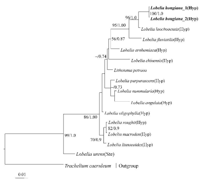 基于atpB, rbcL和ITS构建的半边莲属部分类群的系统进化树