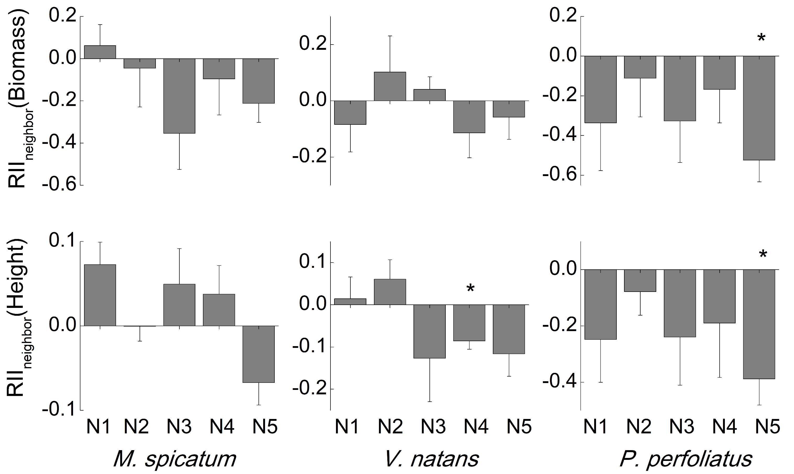 伴生物种对目标物种的相对作用强度RII(Biomass)和RII(Height)在不同目标物种和营养浓度间的差异
