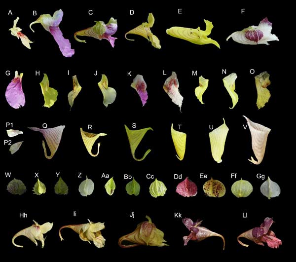 图4. 凤仙花长丝类群的花,侧萼,翼瓣,唇瓣。
