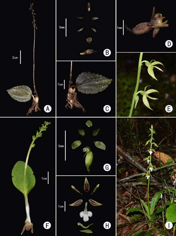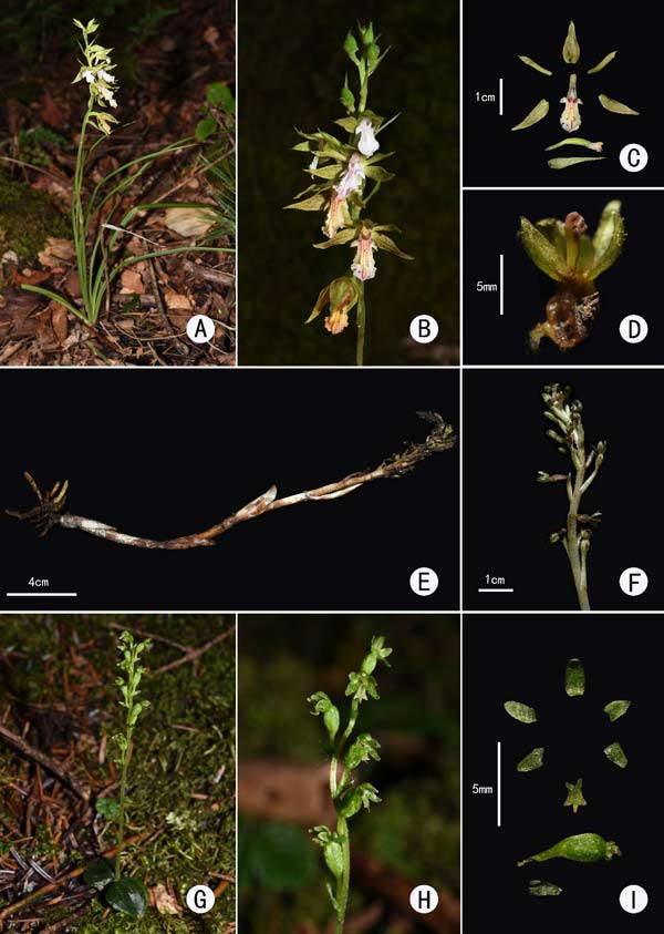 图2. 四川省的新记录兰科植物:软叶筒距兰(A~D)、戟形虾脊兰(E、H 、I)和兜蕊兰(F、G)。